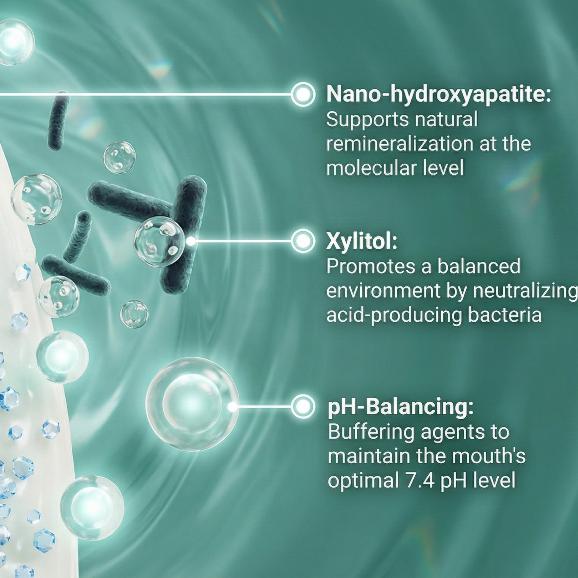 - Nano-Hydroxyapatite: The same mineral that makes up 97% of your tooth enamel. It remineralizes and strengthens teeth at the molecular level, using particles identical in size to those in natural teeth and bones—and in a concentration precisely matched to replace your teeth’s daily mineral loss.